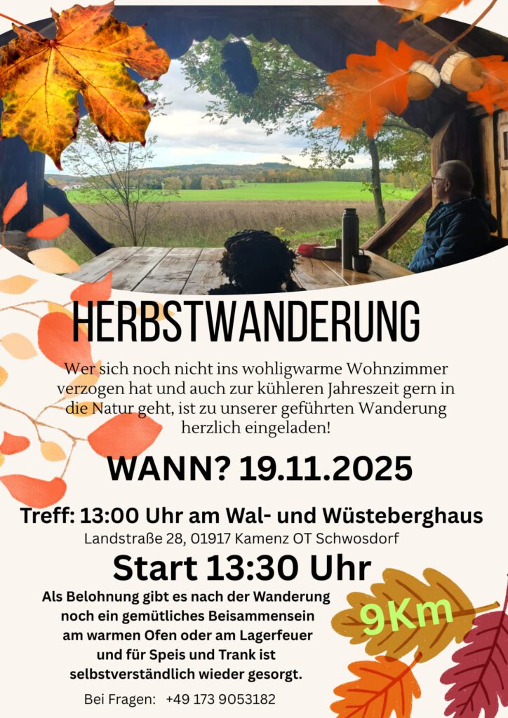 Wer sich noch nicht ins wohligwarme Wohnzimmer verzogen hat und auch zur kühleren Jahreszeit gern in die Natur geht, ist zu unserer geführten Wanderung herzlich eingeladen!